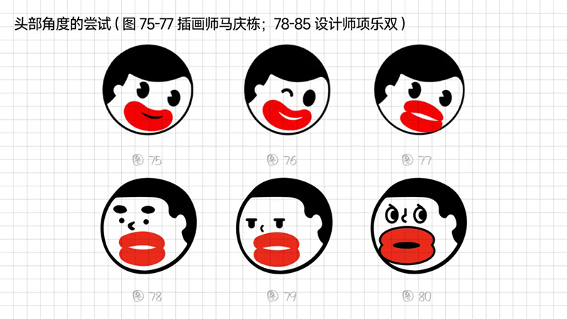 3) Geometric refinement: The eyes, eyebrows, and nose are reduced to a single cup, and when used as monochrome, many details will be blurred, resulting in a greatly reduced final presentation effect. Further simplify the individual elements in the symbols, refine the facial features, remove eyebrows, nose, hairstyle details, and summarize the face into a standard circle. At the same time, it was found that this handling technique gives people a sense of distance, lacks grounding, and lacks a bit of familiarity. Refining and simplifying also require mastering a balance.